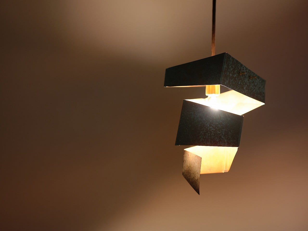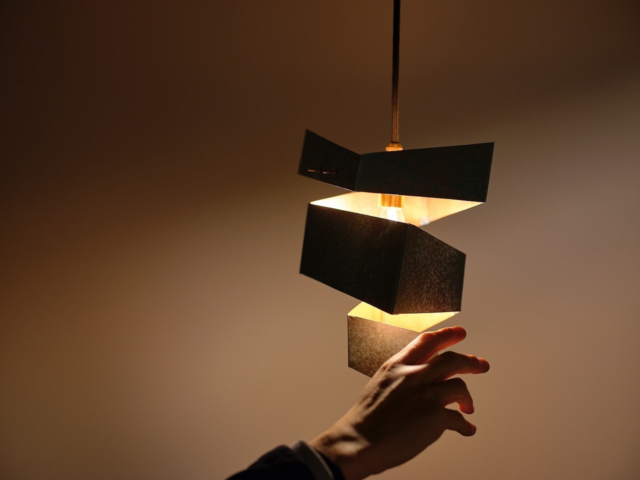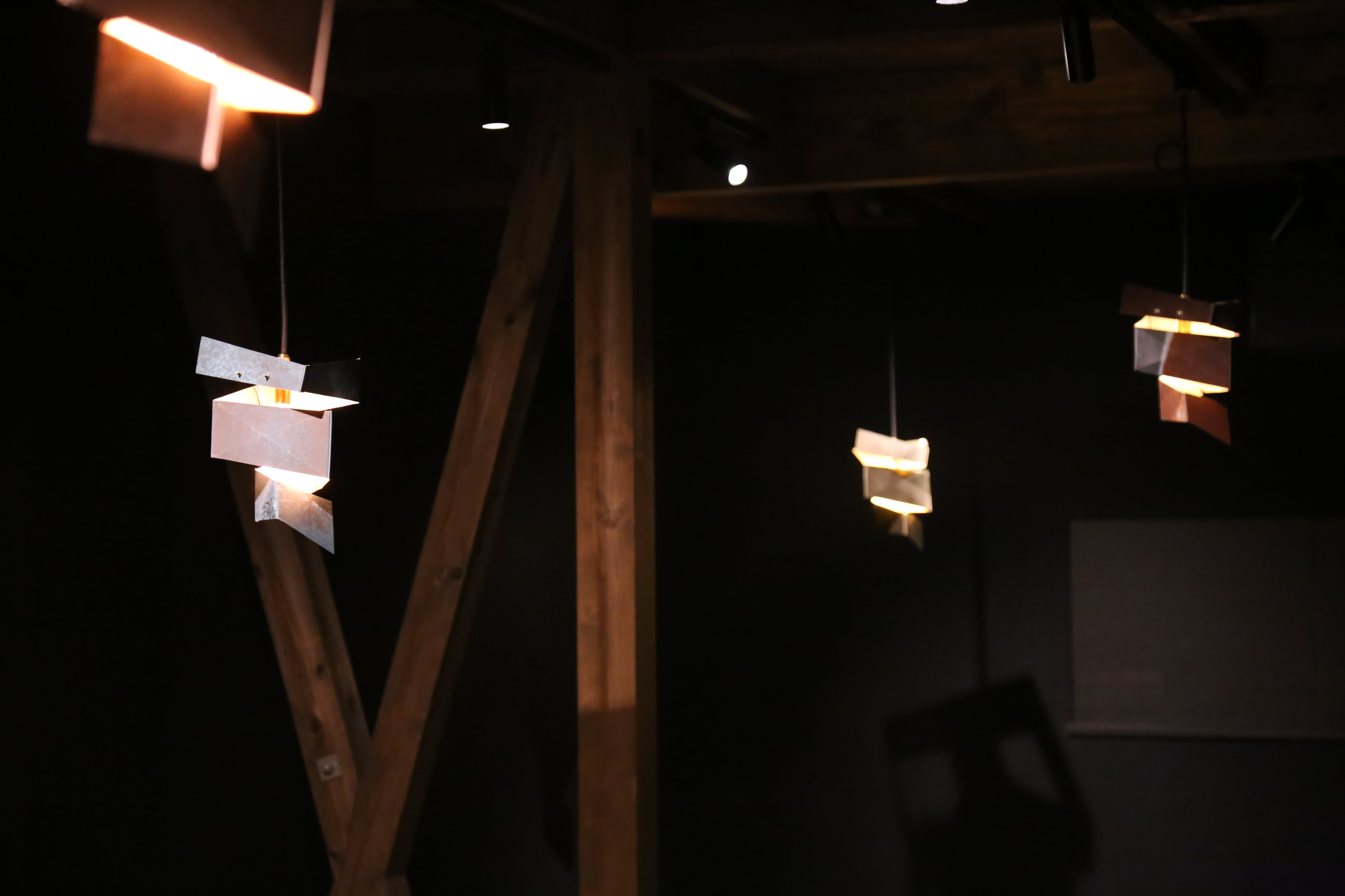建築家・隈研吾氏がデザインし、ウチノ板金の板金職人が命を吹き込んだペンダントライト「渦」 。伝統技法「ハゼ組」を用いて金属板を螺旋状に繋ぎ、光がひらひらと解けるような独創的なフォルムを実現しました 。職人の手仕事が魅せる光の陰影と、時と共に深まる金属の経年変化を空間に添える品です 。